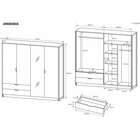 Armoire quatre portes et deux tiroirs avec : Un grand côté penderie à gauche avec une tringle Un coté droit avec quatre étagères une petite penderie avec tringle. Miroir inclus.