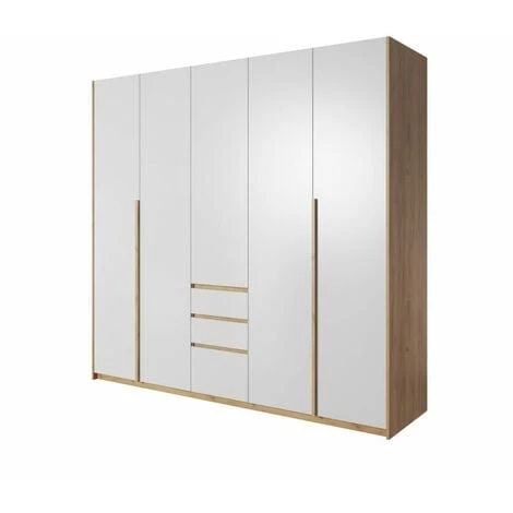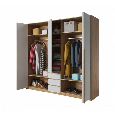 Armoire quatre portes et deux tiroirs (ouverture push to open) avec une partie centrale dotée de quatre étagères et deux penderies avec tringle et étagère de chaque coté. Finition de qualité, résistante aux rayures et à l’humidité.