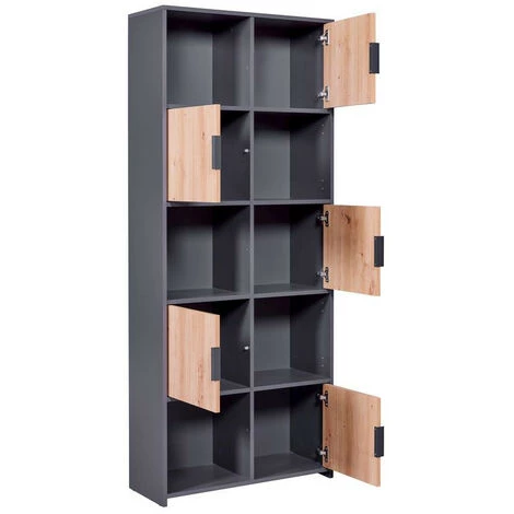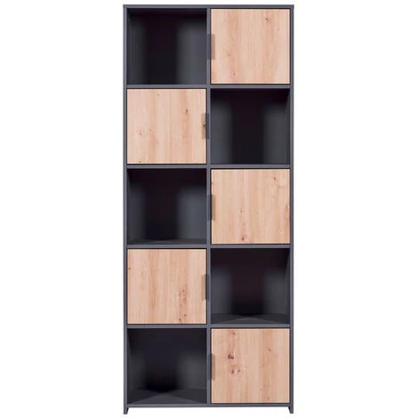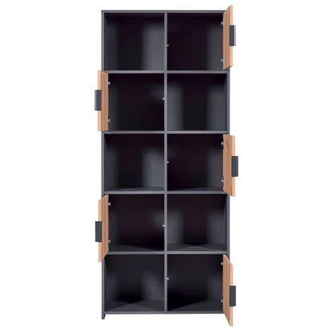 Craquez pour la bibliothèque DESCHAMPS. Très tendance et pratique, elle dispose de cinq niches pour y disposer des livres et de la décoration ainsi que de cinq portes pour maximiser vos rangements. L’association de l’anthracite et du chêne apportera une touche industrielle à votre intérieur