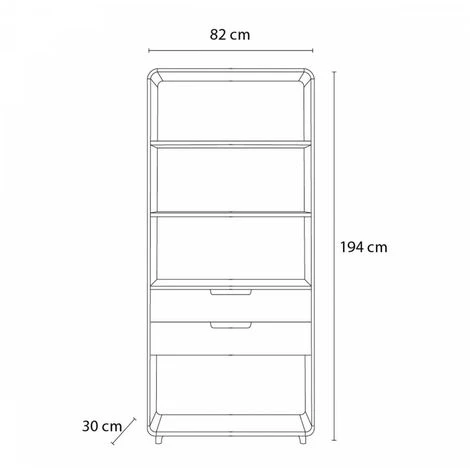 Bibliothèque composée de 4 étagères et de 2 tiroirs. Blanc et bois.
