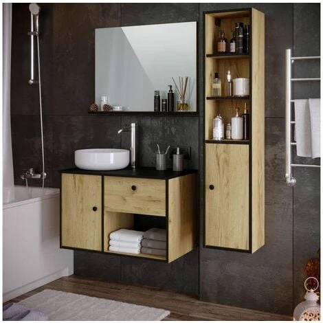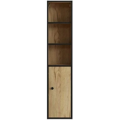 Colonne Salle de bain fabriqué en mélamine chêne rustique avec les chants en noire. 1 Porte + 3 étagères.
