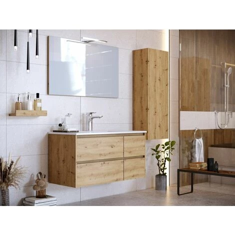 Meuble monté à suspendre. Fabriqué en mélamine bois claire de 19mm pour la totalité du meuble. 2 tiroirs avec biseaus 45º sur les bords supérieurs. Ouverture Soft close. Plan de vasque en céramique inclus. 1Miroir inclus. 1 Meuble Colonne inclus. Robinetterie non inclus.