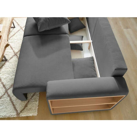 Alliant confort et praticité, le canapé d’angle Envy vous donne la possibilité de choisir la disposition de l’angle selon vos besoins. Vous pourrez également profiter d’un moment de détente avec ce canapé grâce à ses nombreux coussins de dossier et sa fonction convertible, facilement dépliable pour un usage occasionnel. De plus, vous y retrouverez un coffre de rangement, pratique afin de ranger coussins et plaids. Enfin, l’atout majeur de ce canapé est sa tablette en bois intégrée dans l’un des deux accoudoirs, idéale pour y ranger télécommandes et téléphones tout en apportant une touche de chaleur à votre salon.