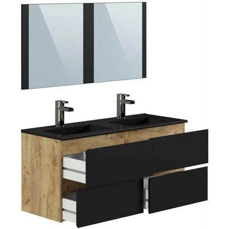 Découvrez le meuble de salle de bain AKELA au design inspiré du style industriel couleur chêne vieilli et aux façades MDF laquées noires mates avec biseau de 45º sur les bords inférieurs et supérieurs. Fonctionnel, il possède quatre spacieux tiroirs noirs et deux vasques en résine noire pour une touche chic. Son design unique et son fini mat embelliront votre salle de bain. Fabriqué en mélaminé, l’entretien de ce meuble sera un jeu d’enfant. Laissez-vous tenter par ses belles finitions et ses nombreux avantages.