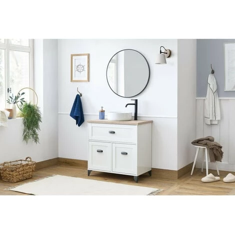 Découvrez le meuble de salle de bain 80 cm DANAE avec son style naturel. Son revêtement couleur blanc et chêne et ses pieds imitation métal apporteront de la douceur dans votre salle de bain !