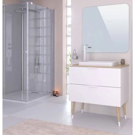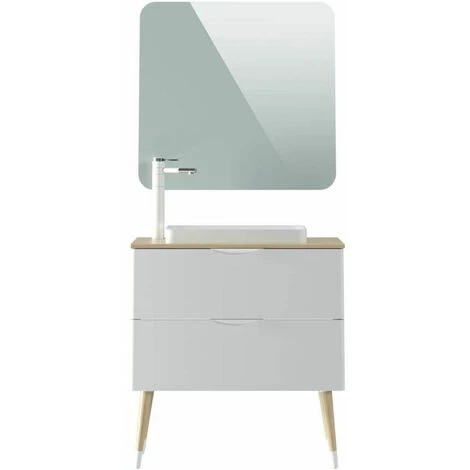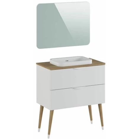 Meuble Salle de Bain 80cm fabriqué en MDF laqué blanc mat avec les coins arrondis. Le top du meuble est fabriqué en mélamine chêne. 4 pieds en bois style scandinave. 2 poignées blanc. Miroir et vasque inclus.