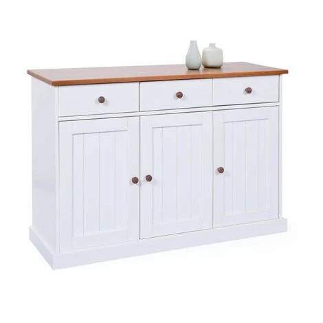 Le buffet WINTERLAND vous permet d’organiser votre intérieur selon vos besoins. Doté de trois portes et trois tiroirs, qui s’ouvrent grâce à des poignées élégantes en forme de boule en métal. Ce meuble en pin massif blanc et sépia est Fabriqué à partir de bois de plantation renouvelée.