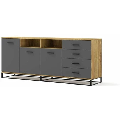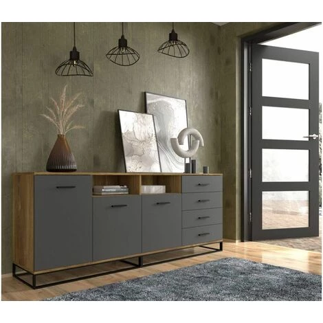 Envie de vous créez une ambiance moderne et tendance pour votre séjour ? Découvrez le buffet DIDEROT et profitez d’un produit de caractère ! Son style industriel apportera beaucoup de style à votre séjour. Très fonctionnel, le buffet DIDEROT dispose de quatres tiroirs, trois portes et deux niches. Ses pieds en métal noir accentue l’esprit loft de ce meuble.
