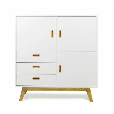 Buffet haut blanc et chêne équipé de 3 portes et 3 tiroirs.