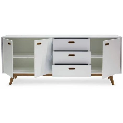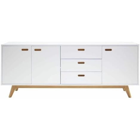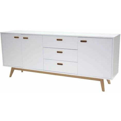 Buffet blanc et chêne composé de 3 portes et 3 tiroirs.