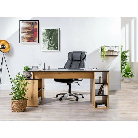 Découvrez le bureau d’angle PRAGUE, avec son design unique inspiré du style industriel. Sublimé votre intérieur grâce à ses belles finitions et ses poignées noires qui amènent une touche chic. Fonctionnel, il est équipé de 2 tiroirs et de 5 étagères. Ses nombreux rangements représentent un atout majeur pour garder une pièce rangée et organisée. Son angle habillera votre intérieur tout en offrant un espace de travail spacieux et dégagé, grâce à son large plateau noir. Très facile d’entretien grâce à sa composition en mélaminé, ce bureau est l’élément idéal pour travailler efficacement depuis chez vous.