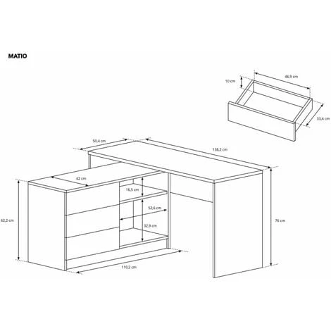 Bureau d’angle avec un coté doté de trois tiroirs (possibilité de montage à gauche ou à droite). Possibilité de montage de niches à gauche ou à droite selon vos besoins. Finition de qualité, résistante aux rayures et à l’humidité.