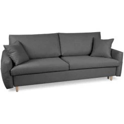 Craquez pour le canapé 3 places LYSE au look moderne et élégant. Son coffre de rangement et son couchage d’appoint (192×140 cm) rendent ce canapé très fonctionnel. Ses pieds en bois, ses accoudoirs arrondis avec les pochettes et 2 coussins déco fournis vous permettrons de décorer votre salon tout en profitant d’un confort optimal.