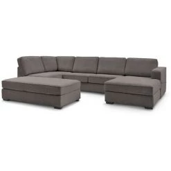 Canapé d’angle U panoramique avec passepoil et pochette sur l’accoudoir. Transformable en lit de 310×152 cm grâce à son pouf.