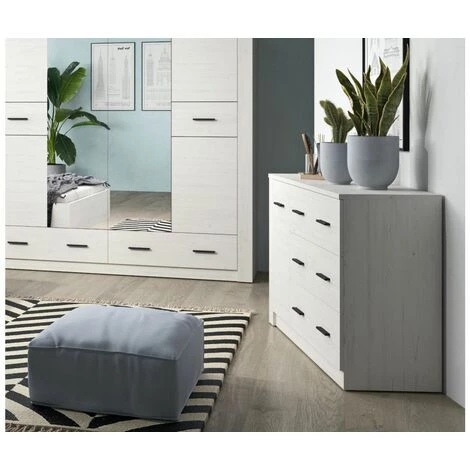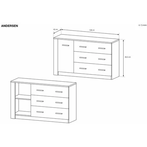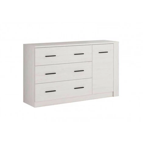 Commode avec trois tiroirs et une porte ( une étagère derrière la porte). Finition de qualité, résistante aux rayures et à l’humidité.