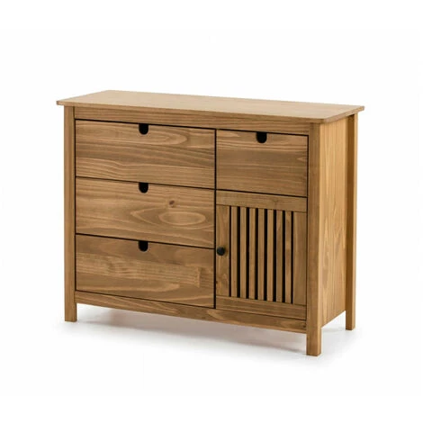 Par son aspect naturel, la collection «CAPRI» vous permet de créer un intérieur à l’ambiance épurée, inspirée du style campagne chic. Les lignes simples et les couleurs intemporelles apporteront une touche très élégante à votre salon et votre salle à manger. Dotée de nombreux rangements cette collection est également très fonctionnelleCommode CAPRI quatre tiroirs et une porte Dimensions : 100 x 40 x 80