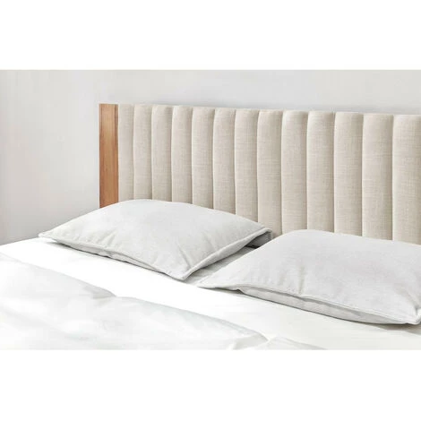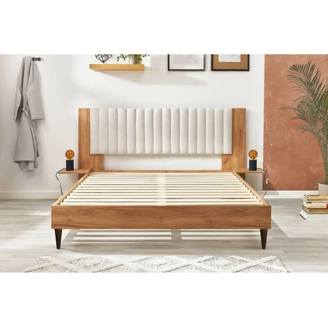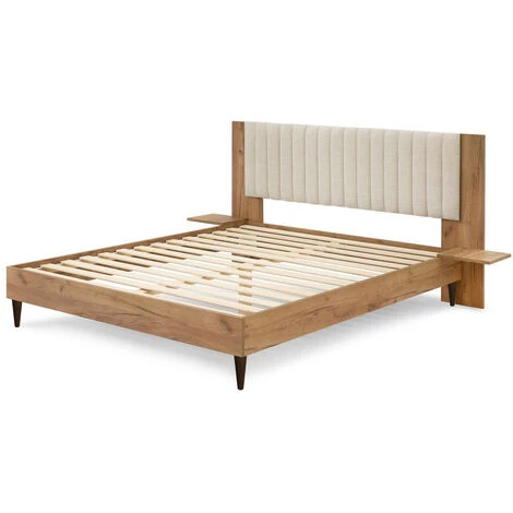 Structure de lit en tissu – Pans de lit Hauteur 17 cm et tĂȘte de lit panneau mĂ©laminĂ© dĂ©cor bois clair et tissu structurĂ© modĂšle SELENA H100 cm chevets intĂ©grĂ©s – 4 pieds coniques droits H15 WENGE – A monter soi-mĂȘme – Montage sans outils -14 lattes massives multiplis