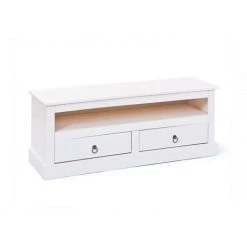 Le meuble TV, fabriqué en bois massif, coloris blanc, dispose de deux tiroirs spacieux et une niche supplémentaire pour des périphériques TV en dessous du plateau supérieur. Un socle prononcé et des œillets concis sur les tiroirs donnent à la commode de TV son élégance classique.