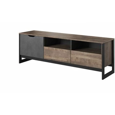 3. Meuble télé avec deux tiroirs, une porte et deux niches ouvertes. Finition de qualité, résistante aux rayures et à l’humidité. Fermeture silencieuse. Glissière à extension totale