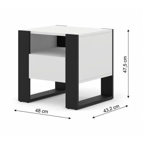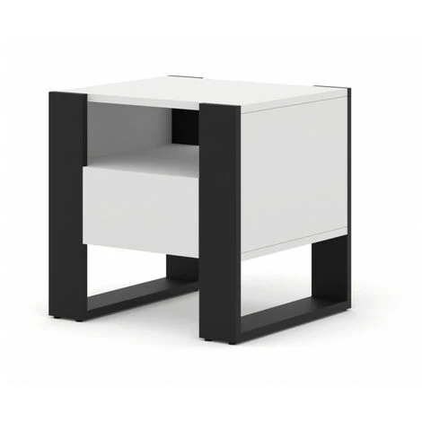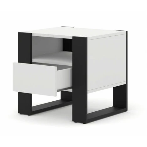 Une table de chevet très moderne et pratique pour la chambre en forme de carré compact. Elle se caractérise par un look moderne et accrocheur – Son charme est déterminé par de larges pieds noirs en forme de cadre qui se démarquent merveilleusement du reste des meubles. Le chevet dispose d’un tiroir et d’une étagère ouverte.