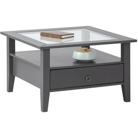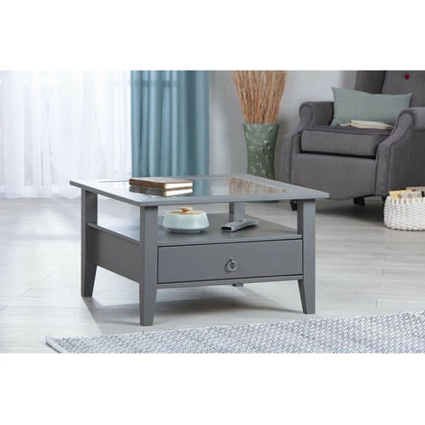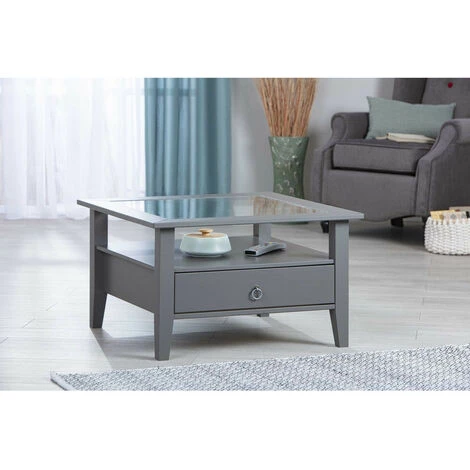 La table basse FOLIERE de couleur grise est fabriquée en pin massif. Elle dispose d’un plateau en verre transparent intégré, d’un espace de rangement pratique et d’un grand tiroir en dessous du plateau de la table.