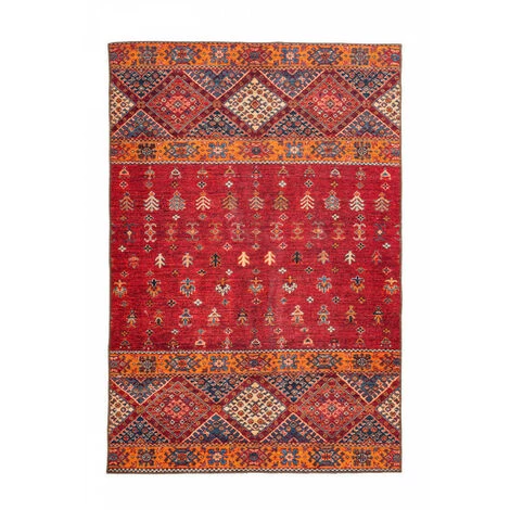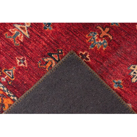 Tapis tissé à plat, dos en coton, motif de style ethnique. ASSA Multicolor / Rouge 120cm x 180cm 100% Polyester. Tissé à la machine. 100% coton. peut être utilisé dans des pièces avec chauffage par le sol. Epaisseur : 6mm. Pays d’origine : Turquie