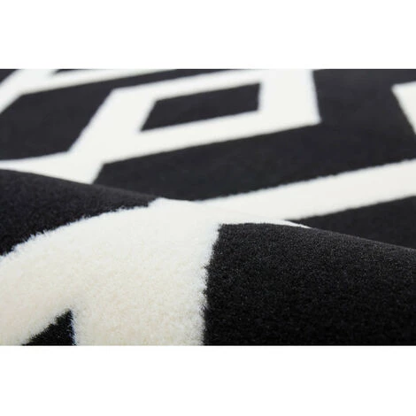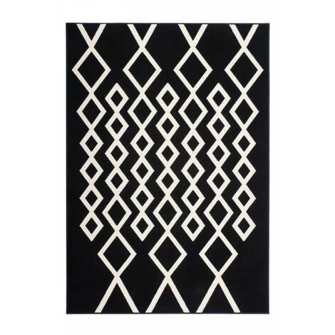 Tapis design motif géométrique, couleurs contrastées IGLI Noir / Ivoire 80cm x 150cm 100% polypropylène BCF . Tissé à la machine. Jute. existe en plusieurs tailles. Epaisseur : 10 mm. Pays d’origine : Belgique