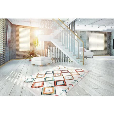 Tapis à franges style ethnique avec des motifs peints à la main. Très originale, touché doux