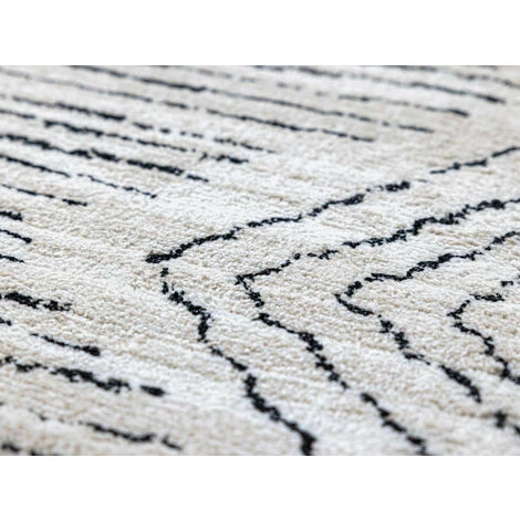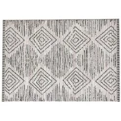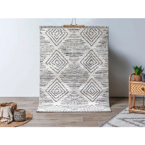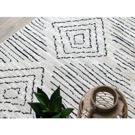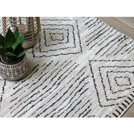 Tapis à poil court de qualité supérieure, tissé avec un fil laineux en polyester de haute densité pour donner une sensation de douceur. Le polyester constitue, pour les tapis, une matière idéale car il est très résistant et facile d’entretien. Motif berbère, couleurs tendances.