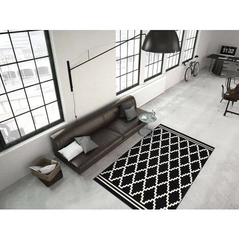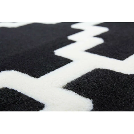 Tapis design motif géométrique, couleurs contrastées IRMA Noir / Ivoire 200cm x 290cm 100% polypropylène BCF . Tissé à la machine. Jute. existe en plusieurs tailles. Epaisseur : 10 mm. Pays d’origine : Belgique