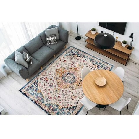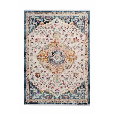 Tapis design oriental, entretien facile VIKI Blanc/ Bleu 160cm x 230cm 100% Polypropylène . Tissé à la machine. 100% Jute. existe en plusieurs tailles. Epaisseur : 5 mm. Pays d’origine : Chine