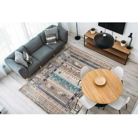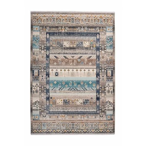 Tapis motif ethno coloré, facile d’entretien, résistant à l’usure VIKI Marron / Bleu 120cm x 170cm 100% Polypropylène . Tissé à la machine. 100% Jute. existe en plusieurs tailles. Epaisseur : 5 mm. Pays d’origine : Chine