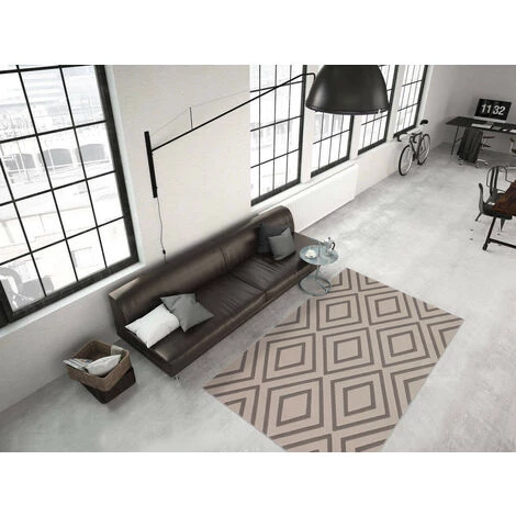 Tapis design motif géométrique, couleurs contrastées ZAGORA Taupe 160cm x 230cm 100% polypropylène BCF . Tissé à la machine. Jute. existe en plusieurs tailles. Epaisseur : 10 mm. Pays d’origine : Belgique
